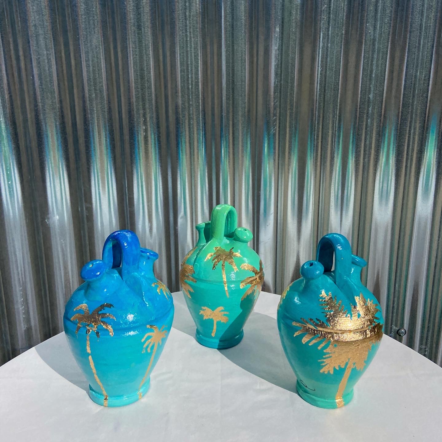 Colección limitada de piezas únicas pintadas en botijos de barro artesanales de Andalucía con acrílico y pan de oro.