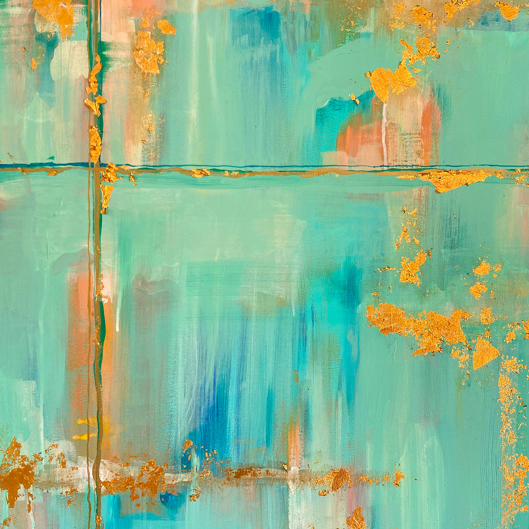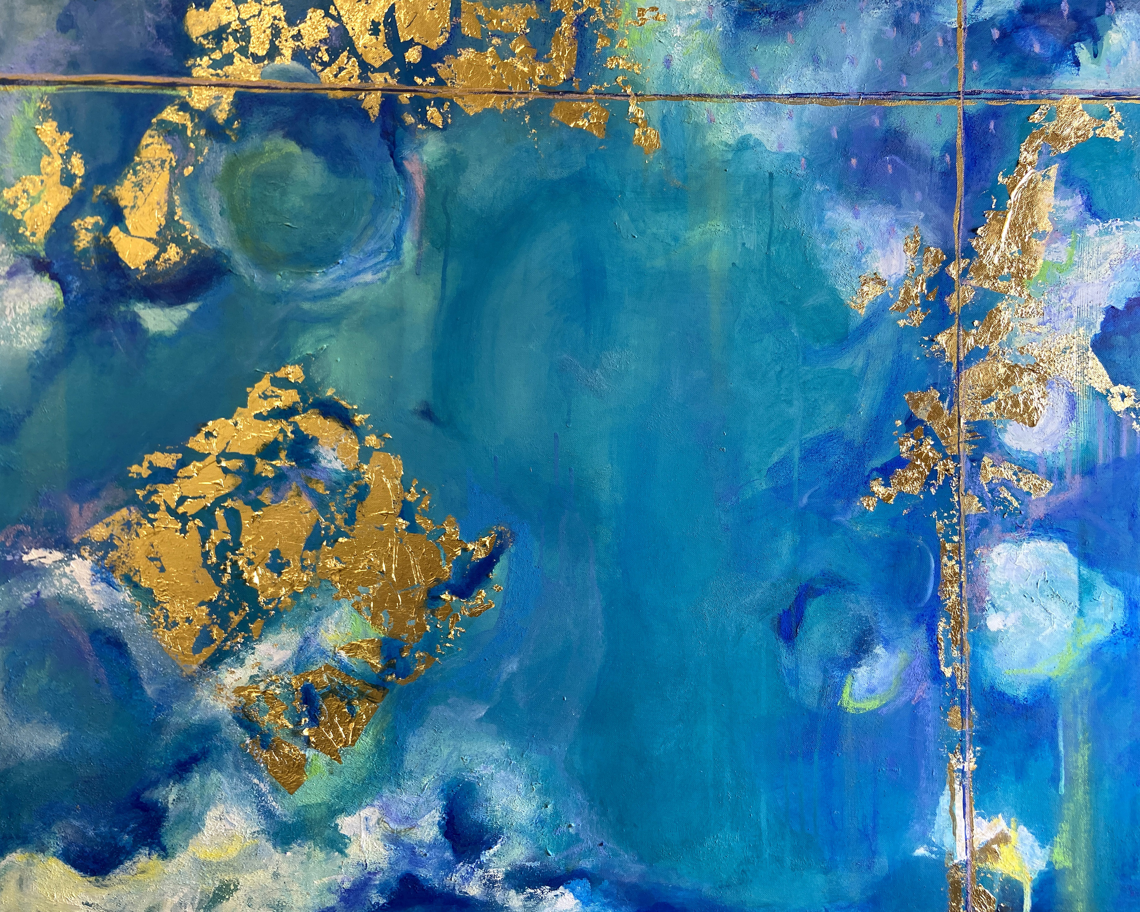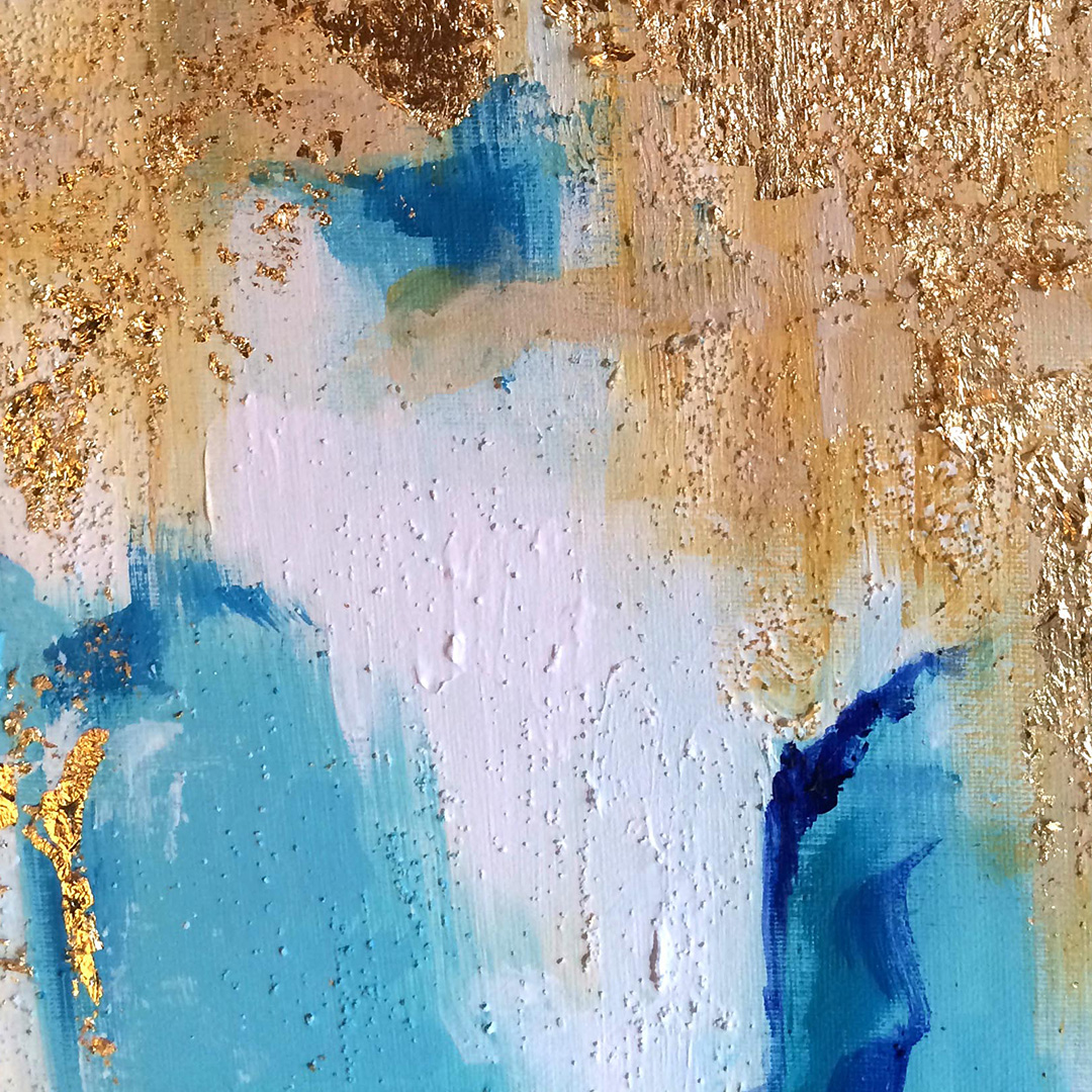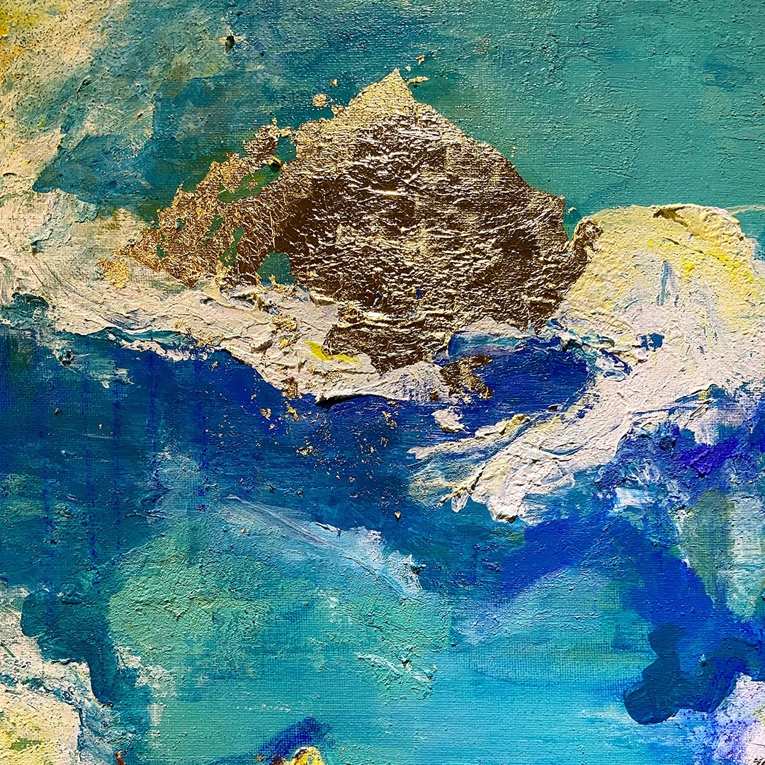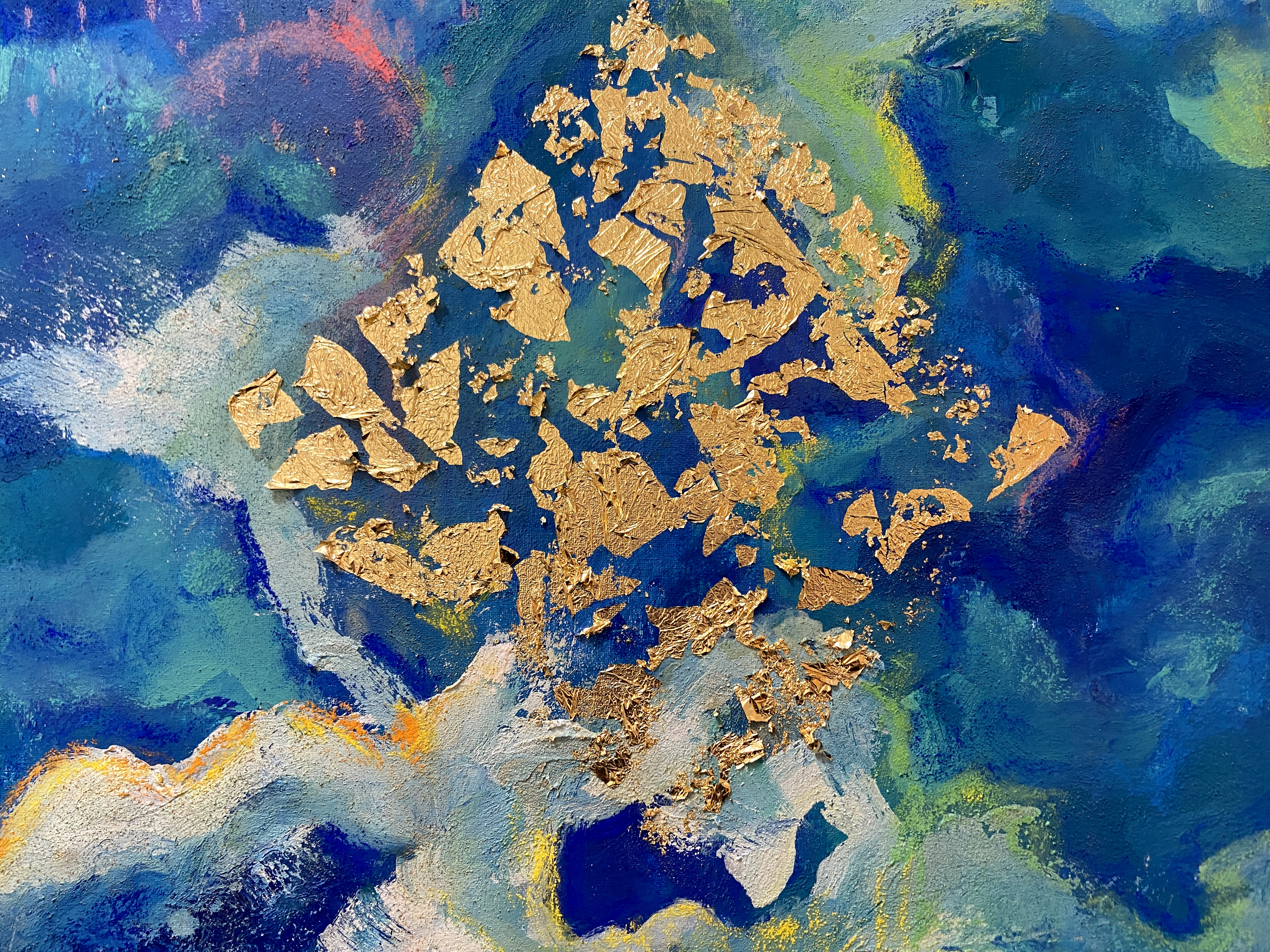 Acrílico, pastel, pan de oro y arena sobre lienzo