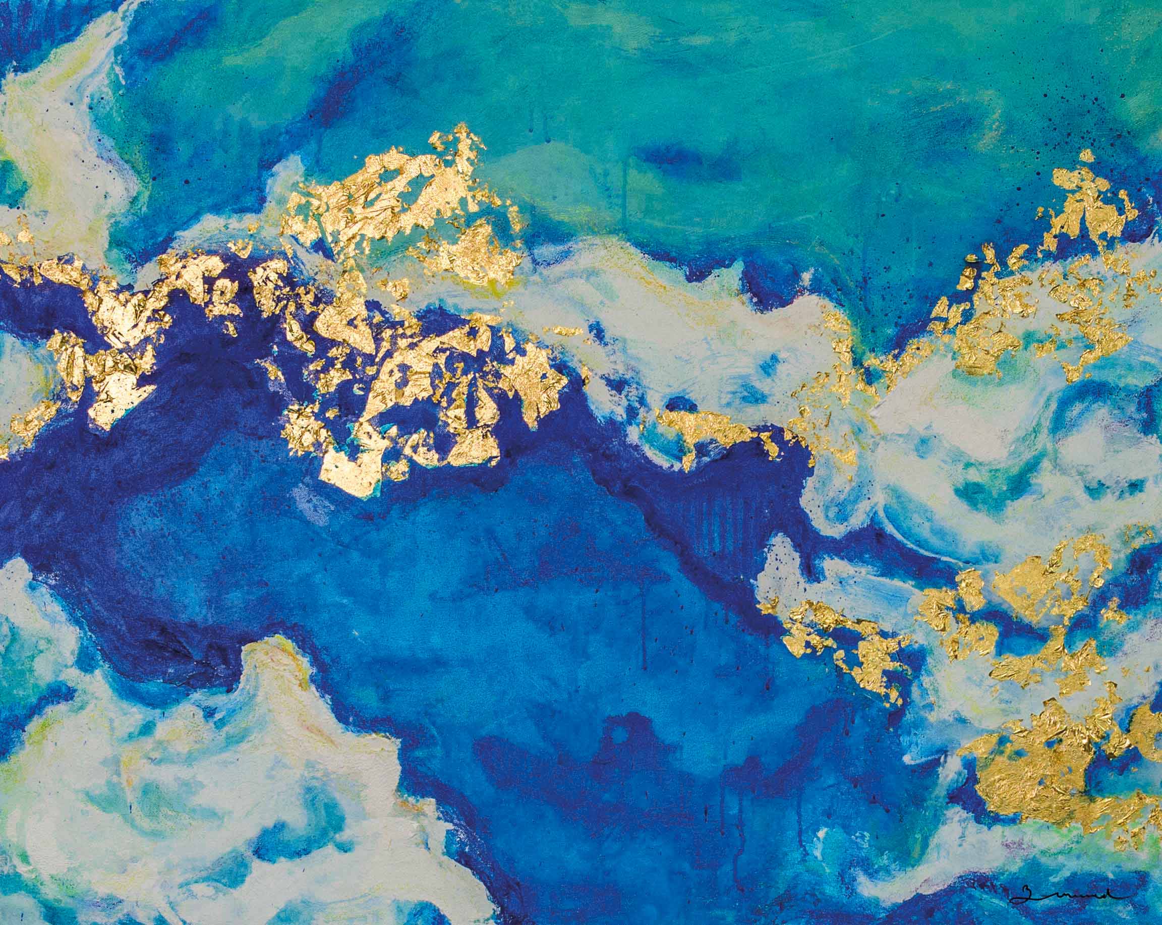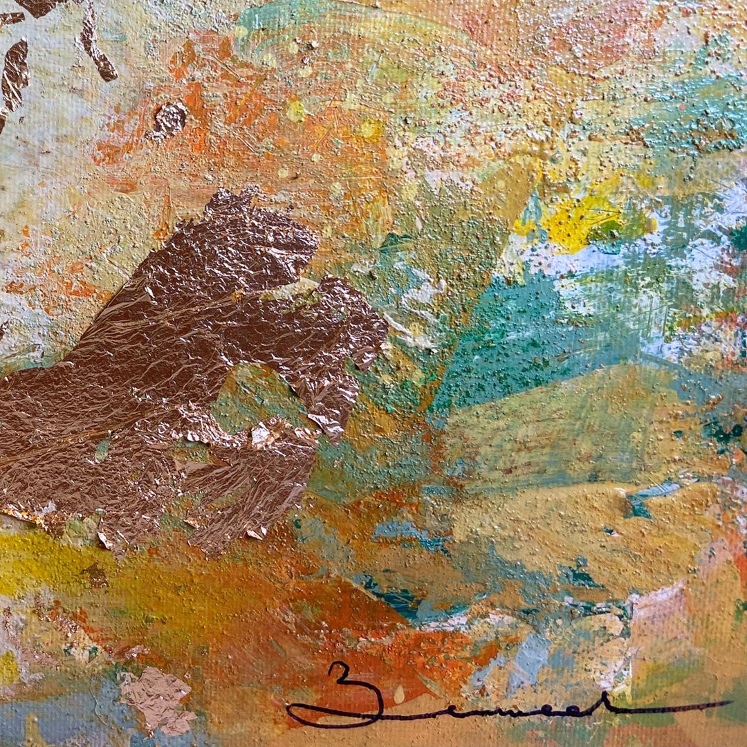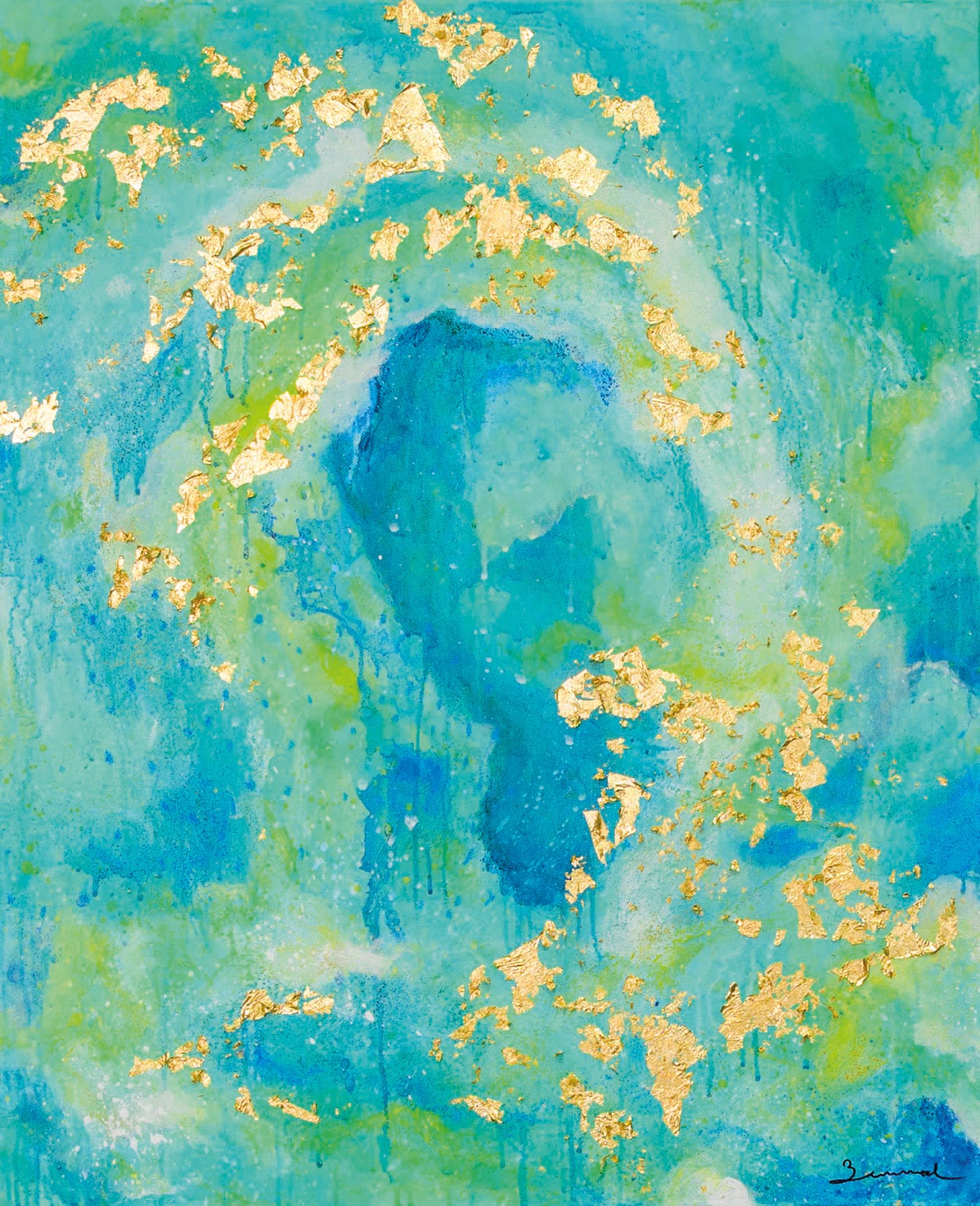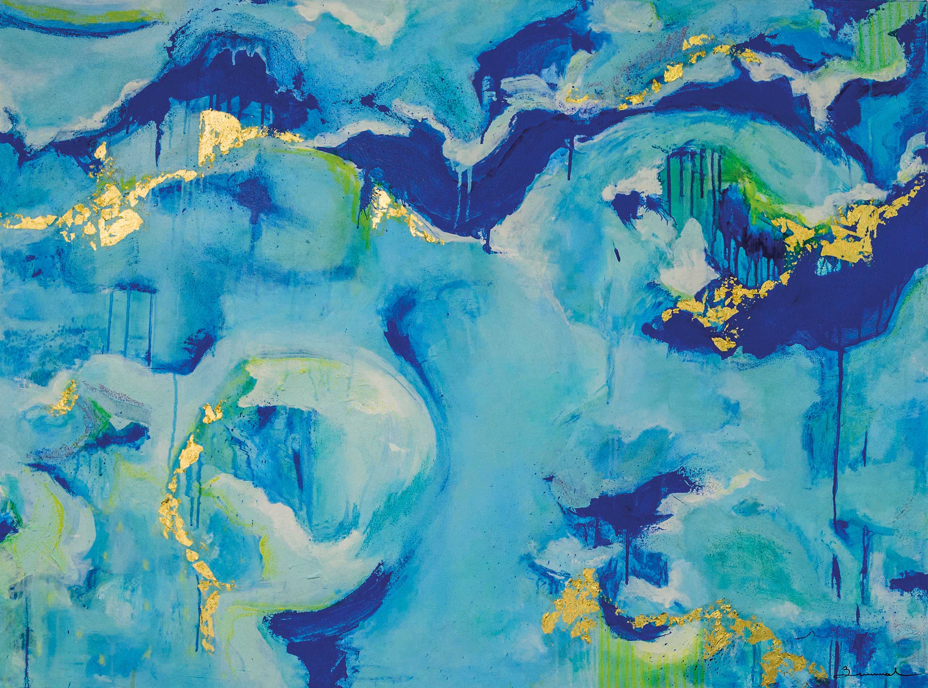 Acrílico, pastel, pan de oro y arena sobre lienzo