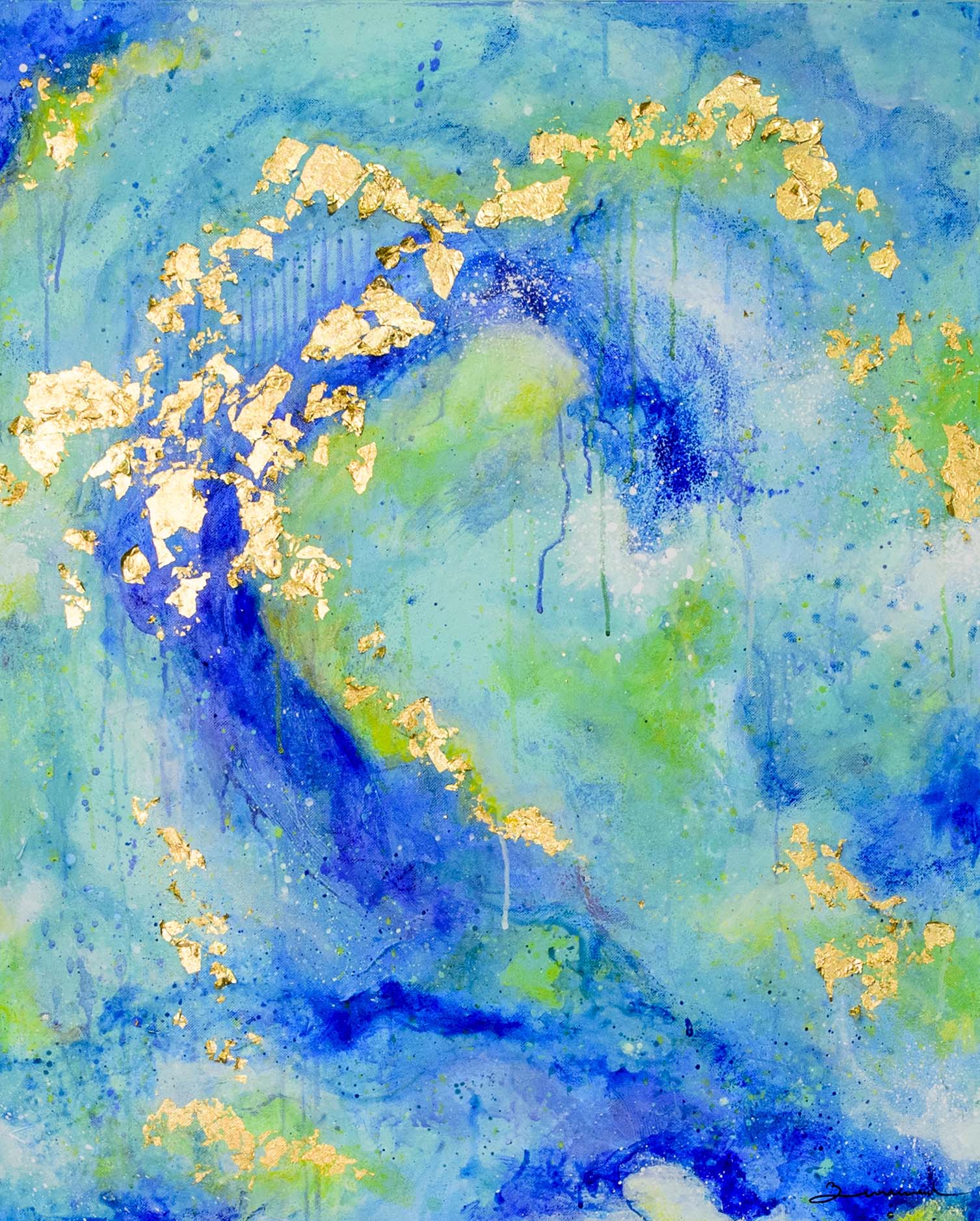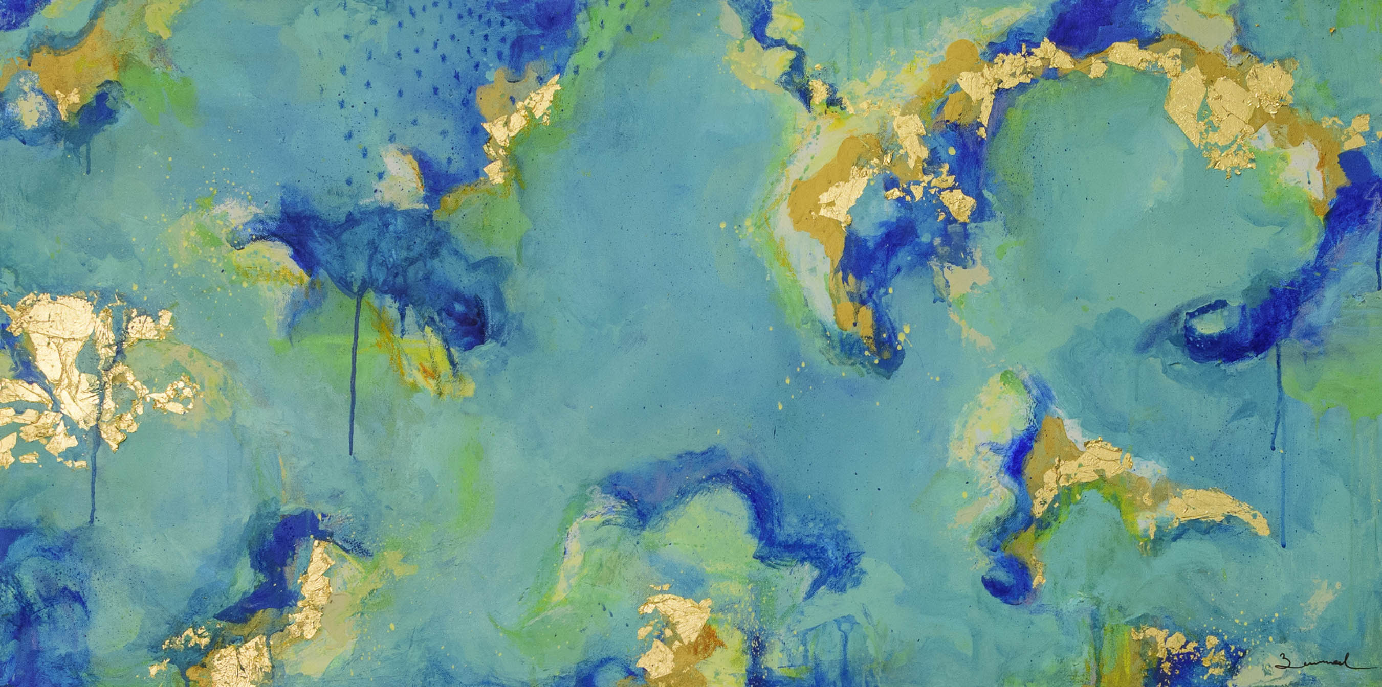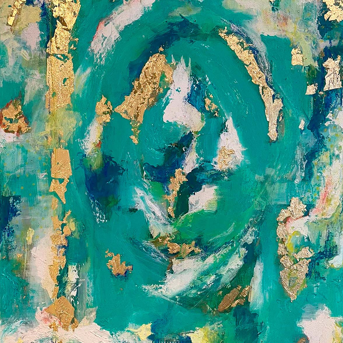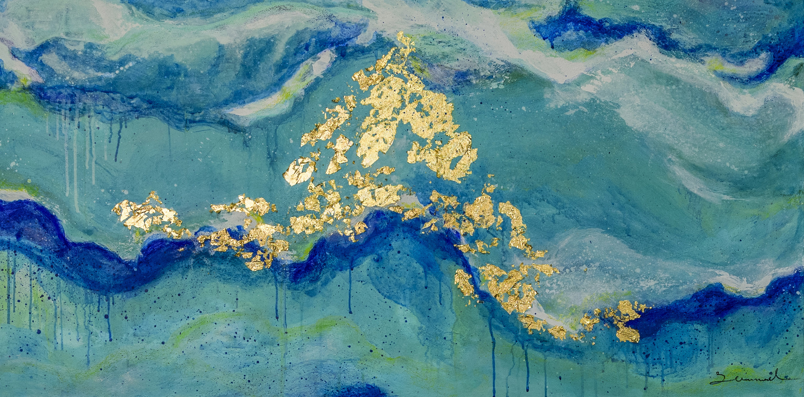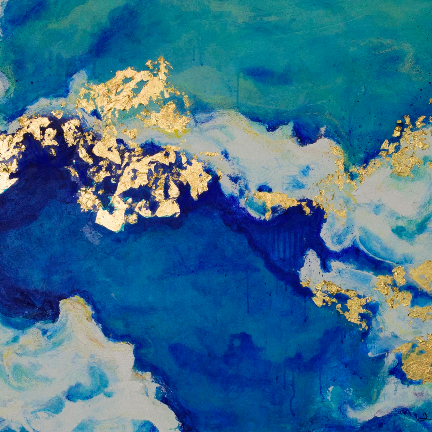 Acrílico, pastel, pan de oro y arena sobre lienzo