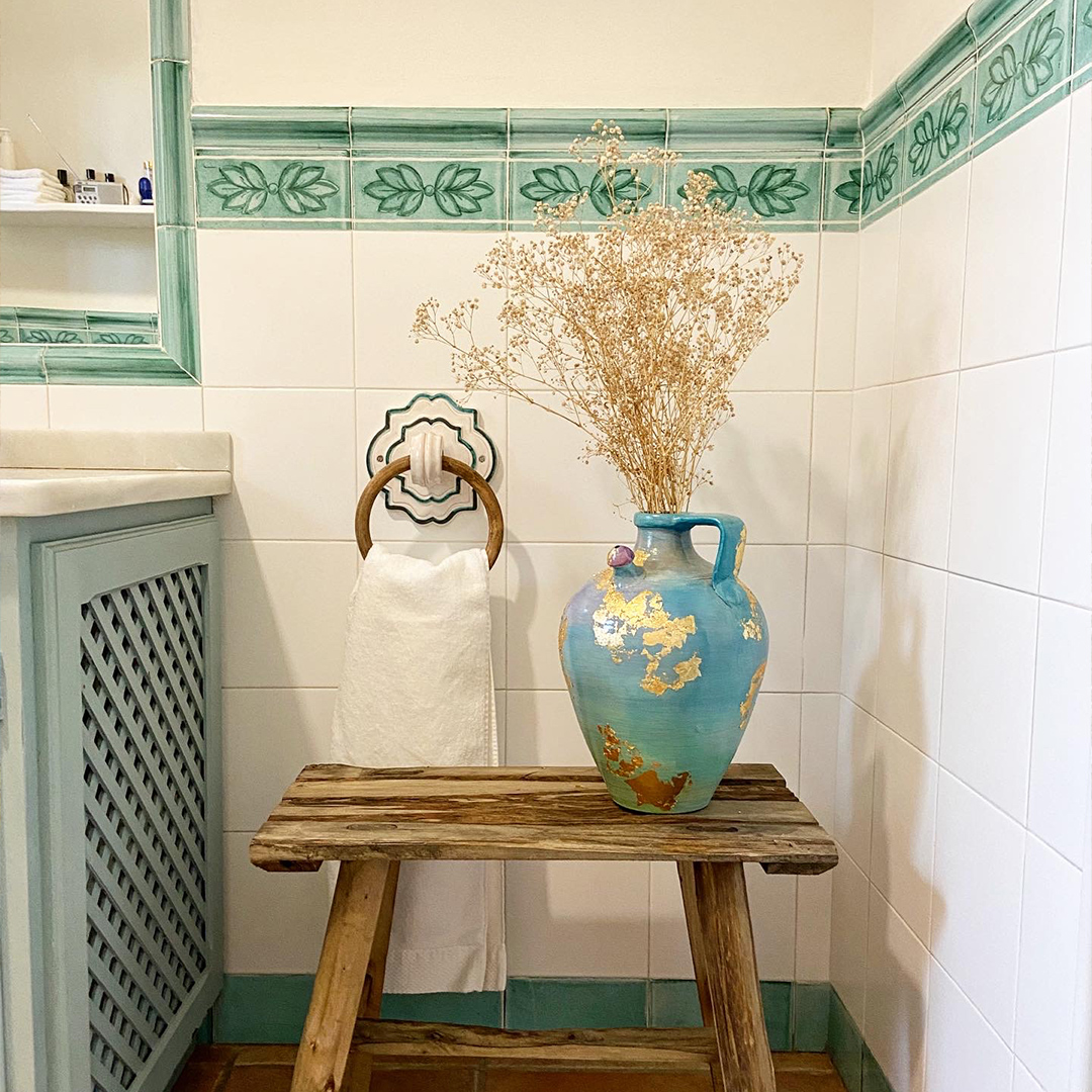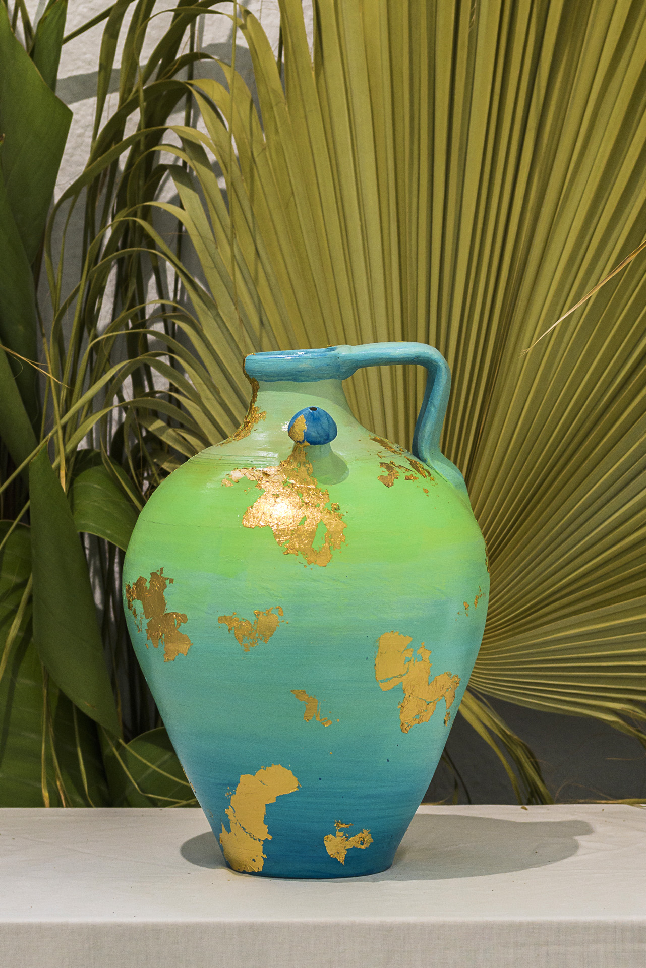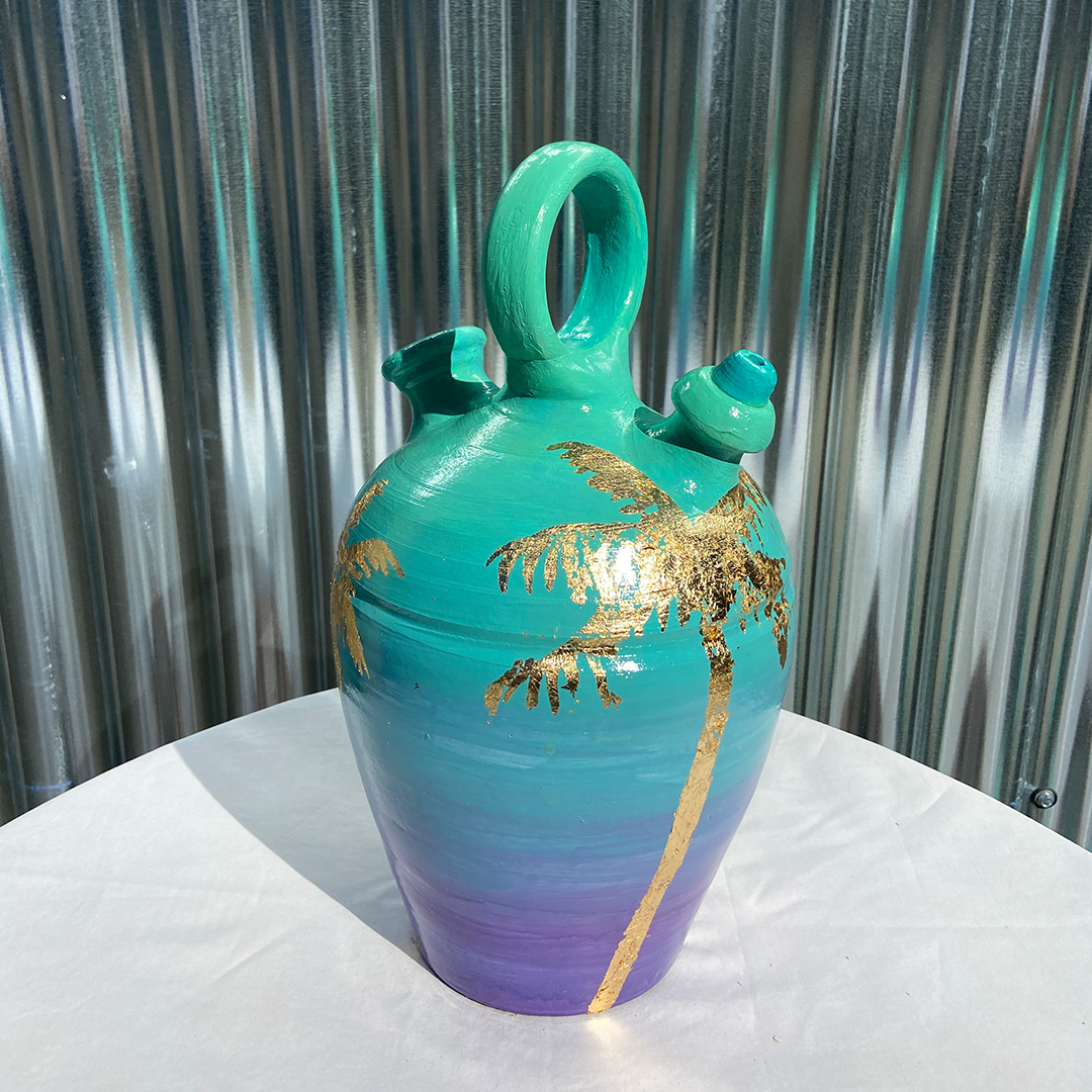Colección limitada de piezas únicas pintadas en botijos de barro artesanales de Andalucía con acrílico y pan de oro.